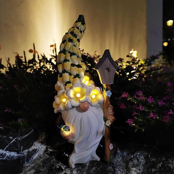 - Cheerful Design: This adorable gnome features a colorful flower hat that adds a playful and cheerful touch to your outdoor decor.