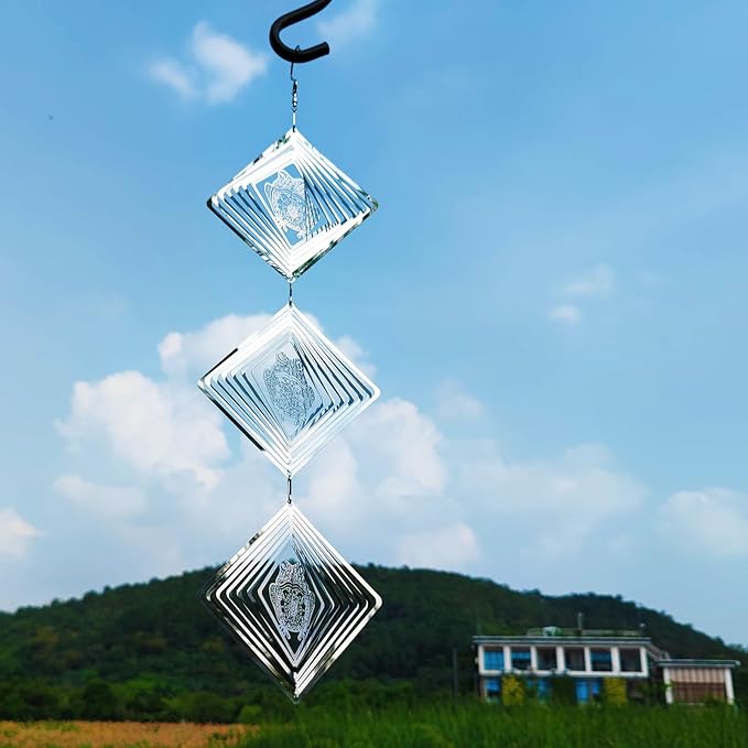 - Our reflective ornamental wind spinners mirror reflection design , uses wind motion and light reflections to keep birds away. Elegant and natural.Great yard art decoration to your home or garden. Creates a mesmerizing spinning effect as it blows in the wind. can hang on lamps, trees, wall, balcony, window, garden, it may be used with a power operated motor so you can enjoy it when there is little wind to twirl the spinner