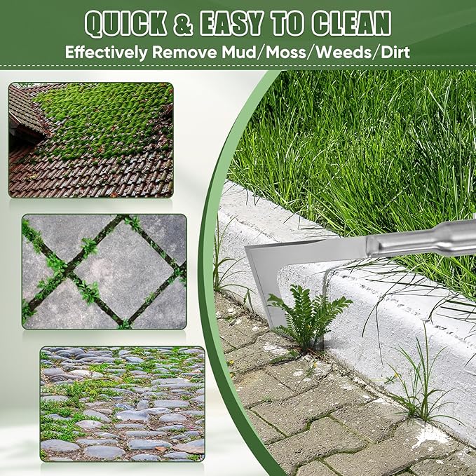 - 🌿【Efficient Crevice Weeder】This garden weeder tool can easily remove weeds and moss in the cracks by simply standing and pulling. It is very suitable for removing stubborn moss and weeds on decks, paths, and terraces. Its sharp, narrow blade can also tear up hard soil. The hand weeder makes your deck, paving stones, patios, and sidewalks more beautiful.
