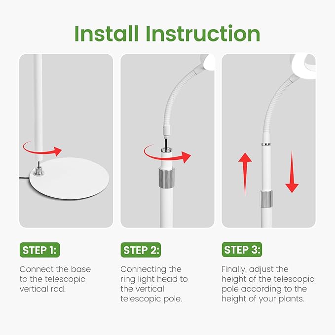 - Desktop Grow Light with Telescope Stand: Equipped with a sturdy metal base that keeps the plant grow light stable. Easily adjusts from 13.7 inches to 24.2 inches, with a 360-degree flexible gooseneck. It provides a wider lighting coverage area