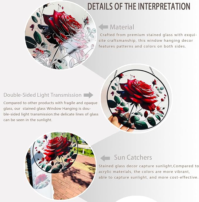 RIVEENY Red Rose Stained Glass Window Hanging,8" Valentines Day Rose Gifts for Wife Girlfriend,Birthday Gift for Women, for Mom Grandma Aunt Sister