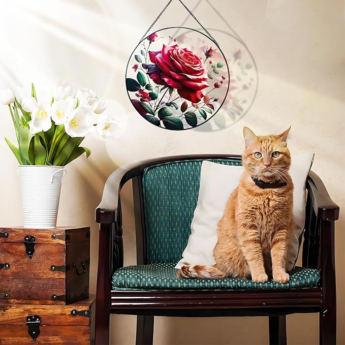 - RED ROSE:The red rose made of stained glass has a special red texture, which is very suitable for indoor or party decor.Hang it on the wall or window, it will emit a charming light through sunlight or light, and it will also remind you and her/him of the good memories