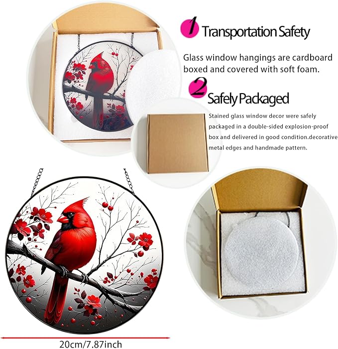 - A Thoughtful Gift for Any Occasion:Our cardinal decor is a meaningful choice for celebrating anniversaries, showing love to family and friends, or simply decorating your home.It's a distinctive decor for bird lovers, family, parents, and friends on occasions like Christmas, Thanksgiving, Halloween, Valentine's Day, Mother's Day, or birthdays. Each stained glass window hanging is carefully packaged in individual boxes with soft foam for maximum protection, ensuring it arrives in perfect condition. Give the gift of beauty and positivity with our red cardinal gifts