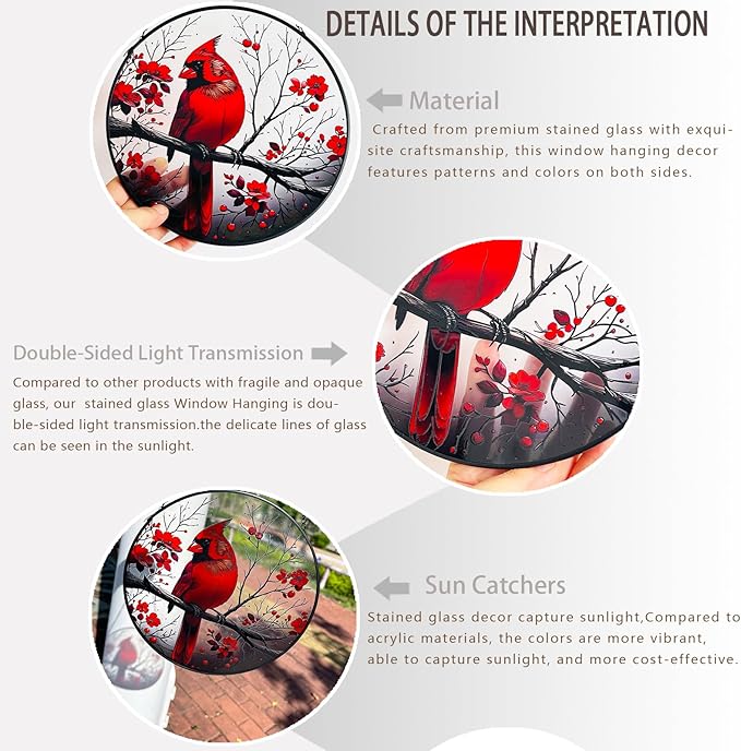 - Enjoy the Elegance of Stained Glass Art :Our stained glass window hangings are crafted from genuine glass, not acrylic, plastic, or metal.The subtle texture and lifelike images of these stained glass birds create an immersive experience that feels like you're amidst nature.The play of light through the stained glass wall art brings out the pretty colors, making it a sight to behold.Whether you're looking for red cardinal gifts for women or a unique decor piece, this stained glass craft is sure to impress