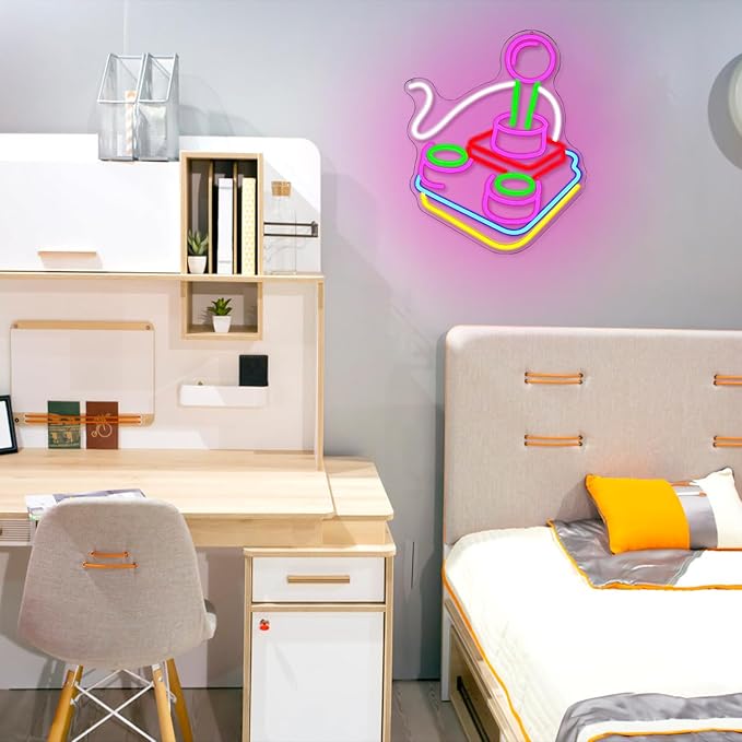 - Safe Material:colorful retro joystick led neon sign made of LED tube technology and silicone tubes and strong and transparent acrylic,game neon lights signs size is 16"x13"(41*31cm),game room decor light up your bedroom,add romantic for wall decoration!