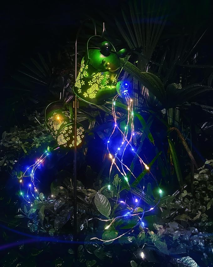 - Upgraded Colorful Solar Watering Can: Elevate your outdoor ambiance with our multicolored Frog-shaped hanging solar lantern featuring 8 light modes and 4 color LED strings, casting a starry glow as if pouring out a constellation. The warm yellow light filters through the exquisite cut-out design, creating a cozy and artistic atmosphere for memorable nights with family and friends