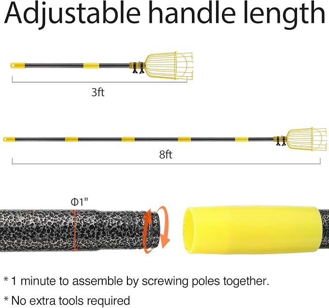 - QUICK INSTAL EXTENSION: The pole's segments securely lock into place through twisting poles together piece by piece, keeping the pole at the desired length for optimal fruit picking reach and stability.