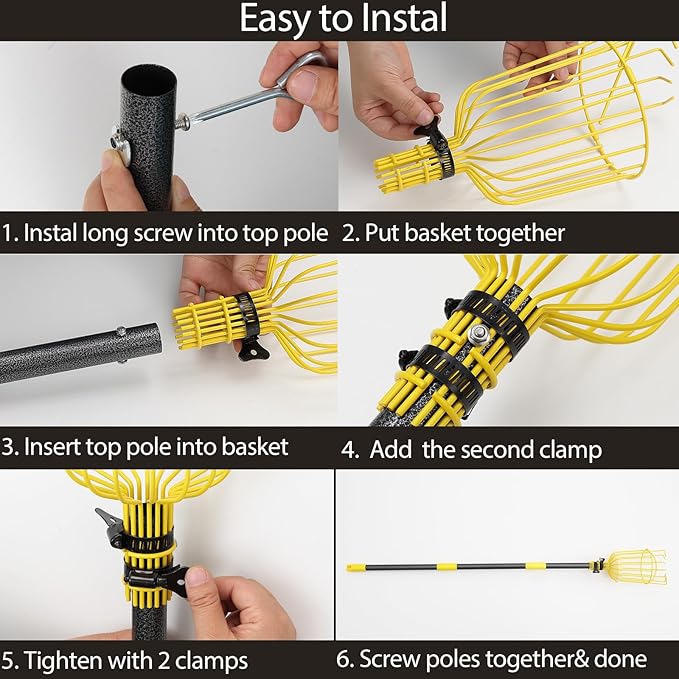 - SECURE BASKET GRIP: A large steel basket securely attaches to the end of fruit picking pole, safely holding multiple fruits like apples, oranges, or avocados for easy harvesting without dropping.