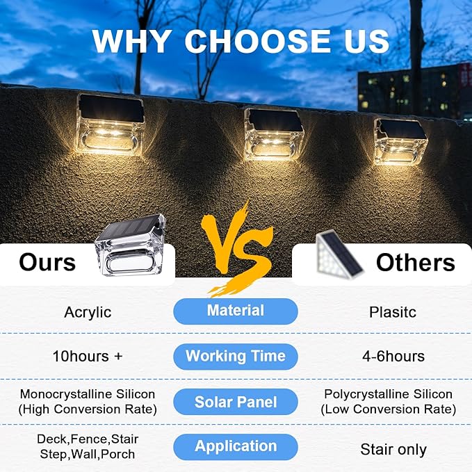 - đ ăIP65 Waterproof & Long Working TimeăThe Solar Fence Lights are made of high-quality acrylic and high-strength ABS material, with an IP65 waterproof rating, ensuring the long-term durability of the step lights. In addition, the solar outdoor lights installed on the fence can withstand various extreme weather conditions, bringing you a more comfortable outdoor experience.