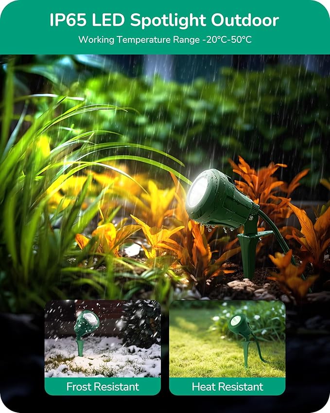- [Durable & Waterproof] Built to last with a rugged design, our LED spotlight outdoor is IP65 waterproof and weather-resistant, effectively withstands rain, snow, and dust, ensuring consistent performance in all weather conditions
