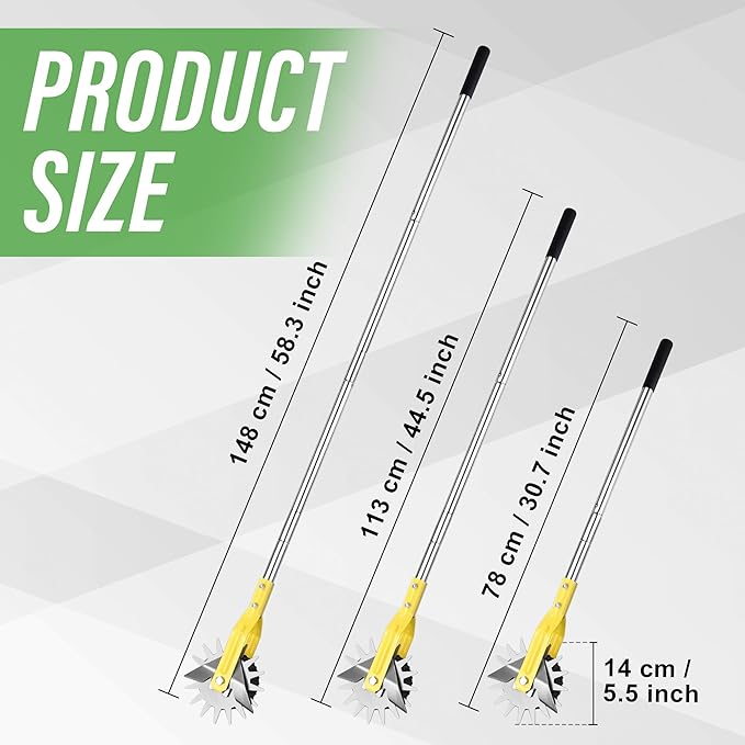 - 【Adjustable Design】: The handle of the lawn edger has an adjustable rod design, and the length can be adjusted according to the height of the lawn and the trimming needs or according to your height and preferences to achieve the ideal trimming effect. Grass trimmer can be set to three different lengths of 58.3/44.5/30.7 in to provide you with a personalized operating experience