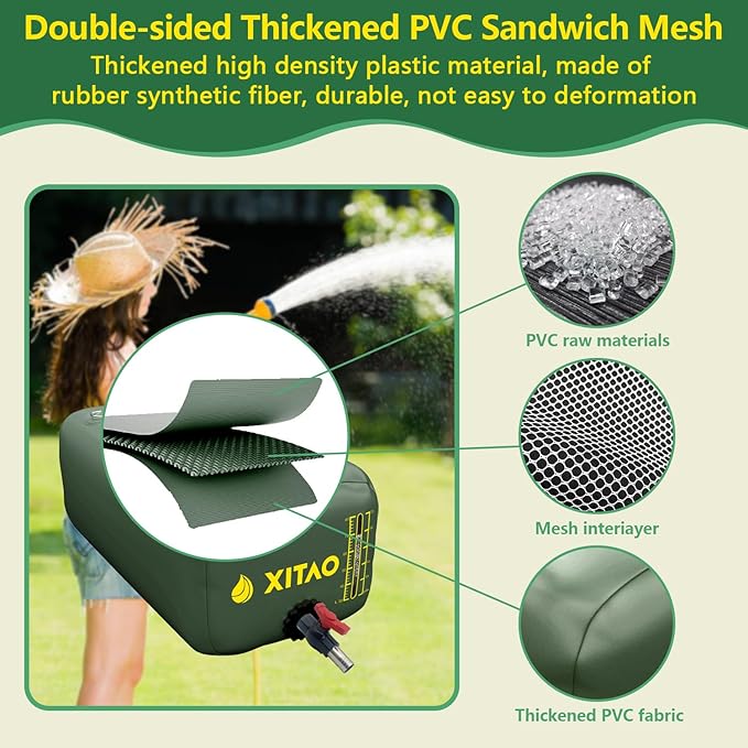 - 【Thicken 1300D PVC Materials】Made from premium thicken 1300D PVC material, this rain barrel is super strong and durable. It has unique properties such as rainproof, fireproof, waterproof, tearing force, non cracking, wear-resistant, stretch resistance and UV resistant, antistatic, and easy to form. Water storage containers can be used repeatedly for many years. This material is also eco-friendly safe, non-toxic and odorless.