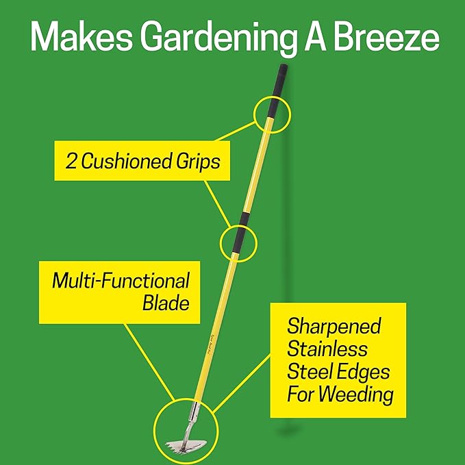 - GARDEN COMFORTABLY - Our 59” long garden hoe handle lets you stand upright, eliminating back strain from bending over, making gardening a breeze. Developed with 2 cushioned grips to ensure a secure and comfortable hold so you can work longer, with ease
