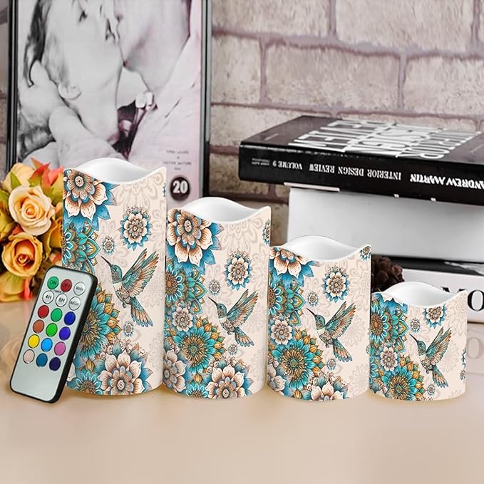 Ystardream Western Hummingbird Flameless Candles with Timer Led Candles Flickering 4 Candle Sets for Home Decor,18 Key Remote Control,Dancing Flames, True Wax, Battery Powered.