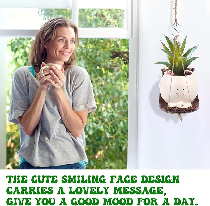 - Swinging Plant Pot:You won’t refuse the CEOJPA swinging flower pot, because no one can refuse an innocent and cute smiling face. Its shape has a whimsical sense of humor, which can light up your life and bring life to your garden and room.