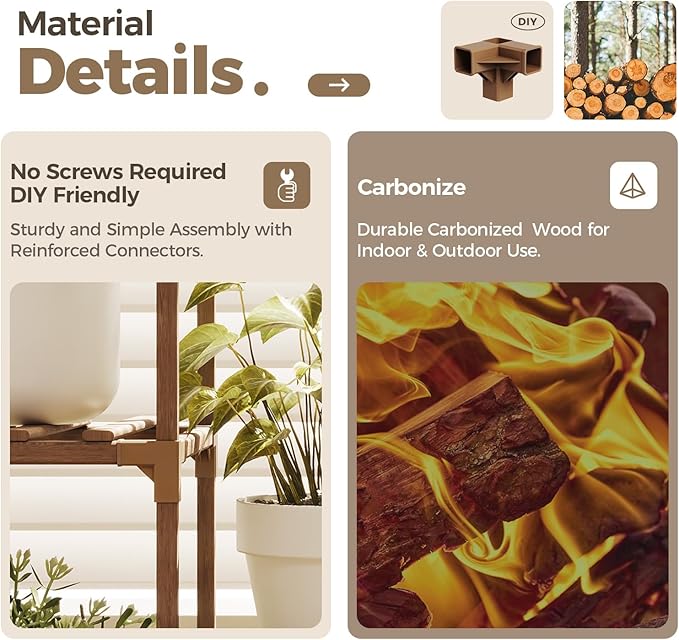 - Premium & Sturdy Wood: Our Wooden Plant Stand is crafted from premium wood, carbonized at 572°F for unmatched water and heat resistance. This process not only extends its lifespan but also ensures it remains a healthy choice, eliminating the need for extra paint or varnish