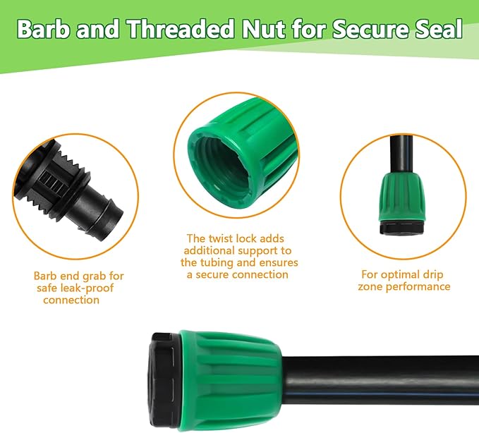 - 【High-Quality Drip Irrigation Tee Fittings】: Crafted from durable high-impact plastic and featuring an integrated design, these 1/2 inch irrigation end cap for 1/2 inch drip irrigation tubing are built to last without deformation or breakage. The barb design ensures a secure, leak-proof connection, while the twist lock mechanism provides additional tubing support.