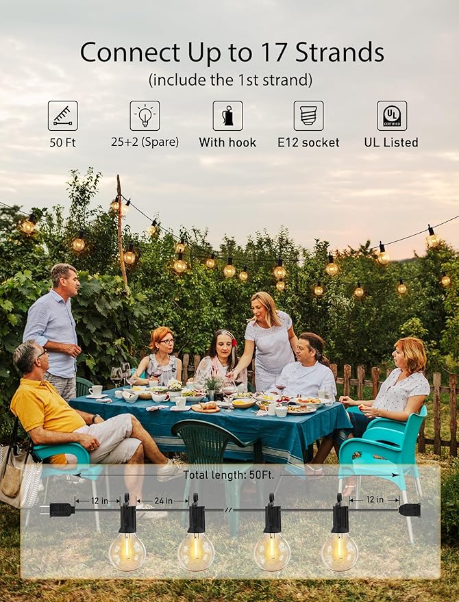 - 【50 feet Outdoor String Lights 】- 2 pack, each pack is 50 feet outdoor string lights with 25+2 G40 shatterproof led bulbs. 24 inch spacing between bulbs. 12 inch lead with male plug, 12 inch tail with female connector. Candelabra (E12) socket base. 1W per bulb. Color temperature 2200K, End to end connect up to 17 strands.