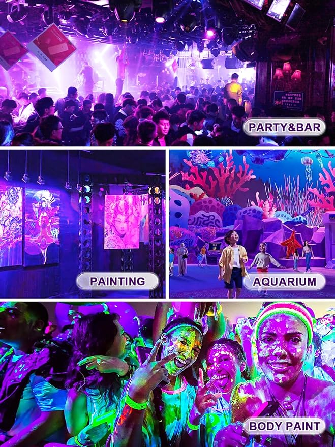 - 【Wide Application】Our blacklight fixture are perfect for indoor and outdoor activities, gallery, special effects, photography, birthday, wedding neon glow party, Aquarium, party, gym, DJ Booths, Outdoor Yard or Lawn, Christmas Halloween Decorations. IP66 waterproof suitable for outdoor indoor use.