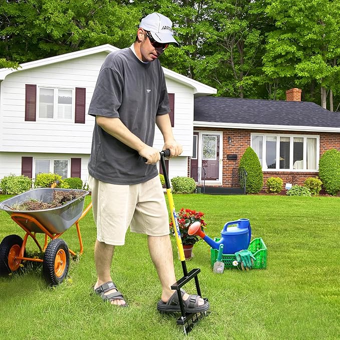 - Sharp Tines: JouZYA's manual lawn aerator is equipped with 4 sharp tines, which maximize the power of the tines in the soil.This grass aerator tool can effortlessly insert the tines into the compacted soil, helping the soil breathe freely. Therefore, aerating your lawn becomes an efficient and easy task