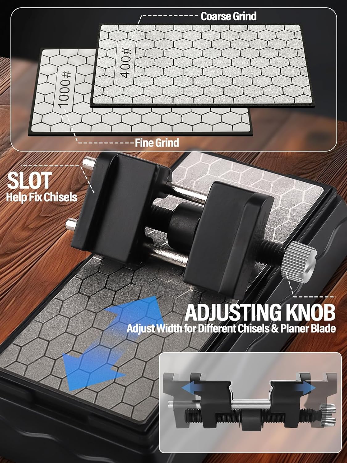 - √ Professional Sharpening System: Chisel sharpening kit includes 400/1000 grit double-sided honeycomb surface plate, non-slip base, honing guide and angle guide, which is a complete honing tools set for sharpening knives, planes, chisels and other cutting tools.