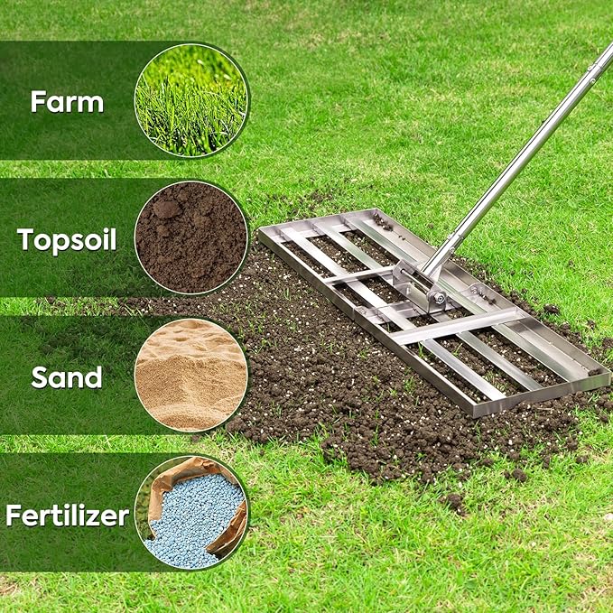 - 【Multipurpose Use Lawn Leveler】This lawn leveling rake is ideal for removing any unwelcome dips and bumps, clearing stones from the soil, preparing the land for planting, leveling the golf course and playground. You can fill the surface with top soil, dirt, compost, peat moss, manure or sand.
