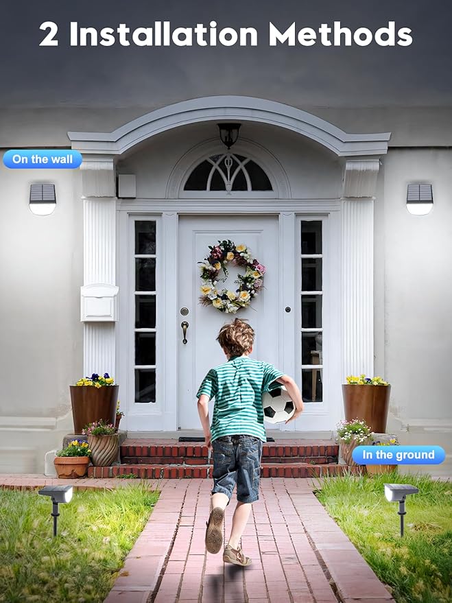 - 🥇Wide range of applications🥇 This solar spotlight has a flexible structure and can be rotated 90°, providing lighting at different angles, looking down or looking up. We provide a full range of tools and accessories. You can insert the solar spotlight into a flower pot or grass as a garden light, or install it on a wall or fence as a wall light. Suitable for garden paths, porches, terraces, garages, balconies, decks, walkways, driveways, and swimming pools.