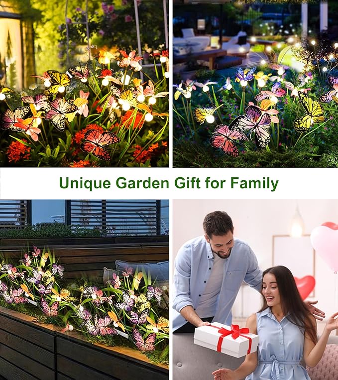 - 【Garden Decorations & Yard Decor Gift】Perfect Gift for Garden Lovers-With their stunning design and reliable construction, these solar butterfly lights make a perfect gift for birthdays, housewarmings, or any special occasion. A thoughtful, practical gift for anyone who loves nature and outdoor decor, these lights will brighten any garden, yard, or patio.