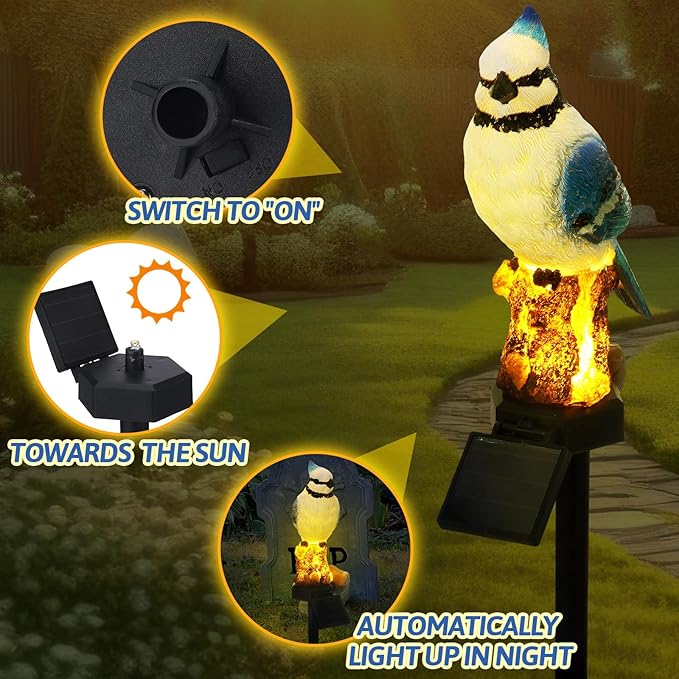 - Solar Powered: these blue jay decor stake lights take advantage of solar energy for their operation; The integrated solar panels absorb during the day and turn it into power, powering the LED light automatically at night without requiring electricity