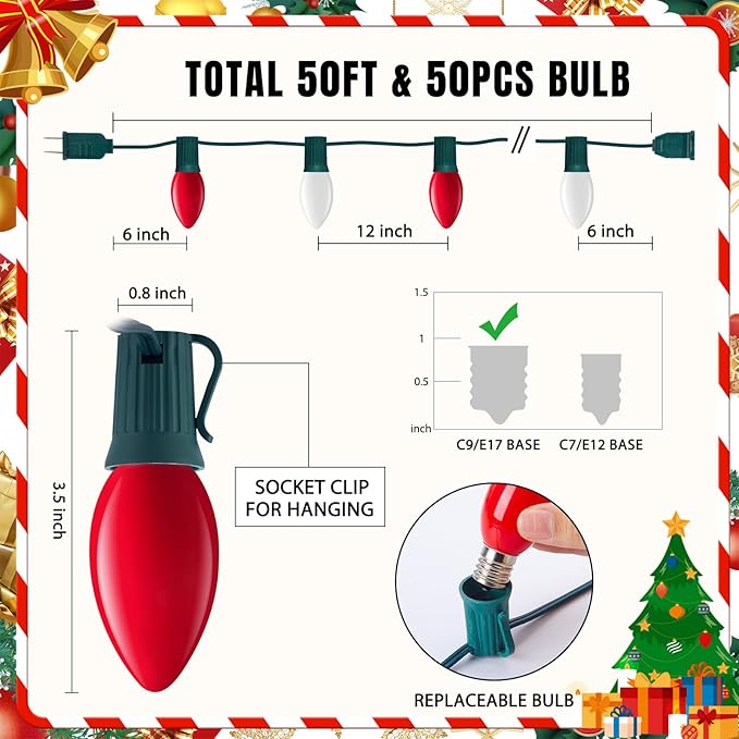 - 50 FT Vintage Outdoor Christmas Lights: 50 feet length with 50 +2 C9 bulbs (2 spare), E17 base light sockets.Red and White