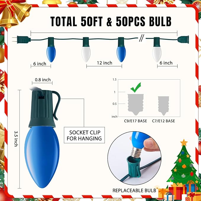 - 50 FT Vintage Outdoor Christmas Lights: 50 feet length with 50 +2 C9 bulbs (2 spare), E17 base light sockets.Blue and White