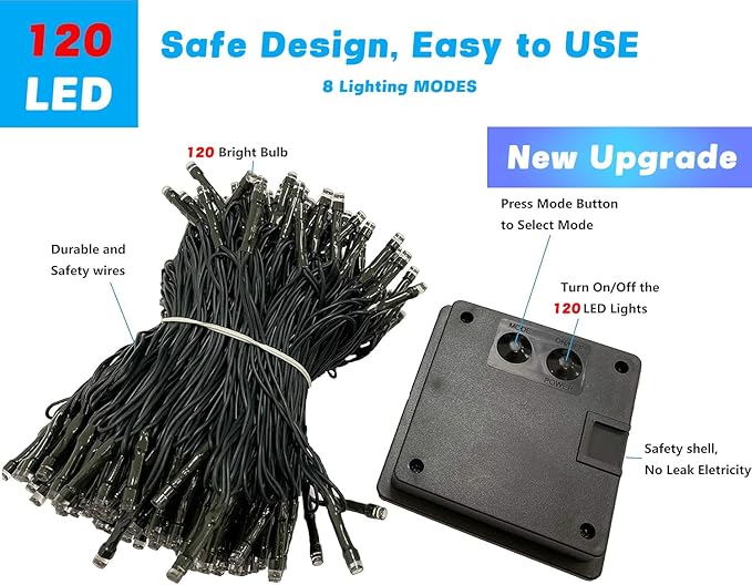 - [Solar Lights Outdoor]:Upgraded each pack of Solar Christmas Lights is 47.5 feet, the lead wire is 6.6 feet, and the bulb spacing is 0.34 inches. Based on the old 100LED, our Christmas decorations lights have added 20LED and lead length, which makes us more free to arrange the scene.