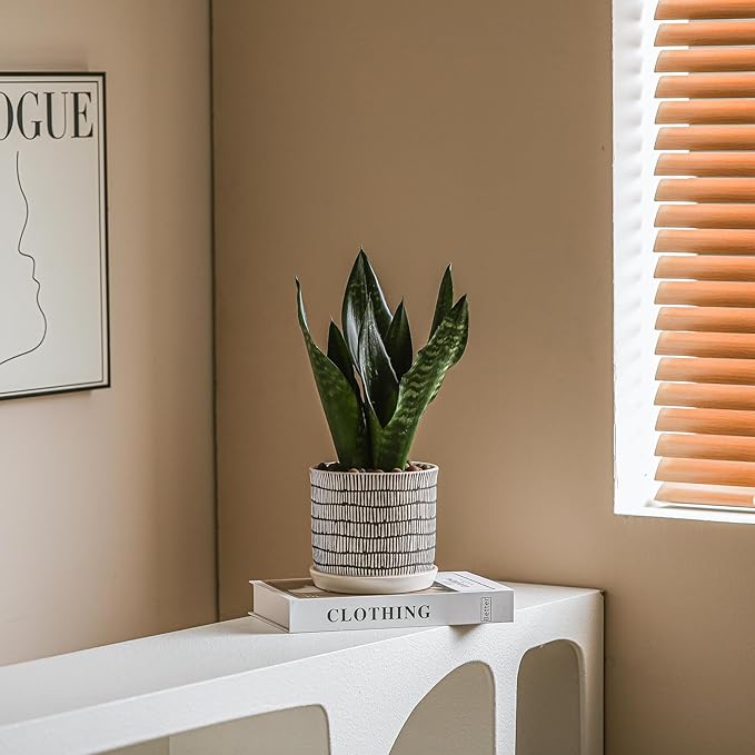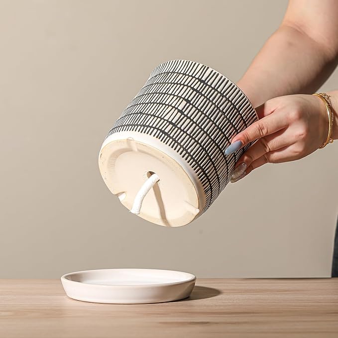 6 Inch Plant Pot: Ceramic Planter with Drainage Hole & Saucer - Cylinder Flowerpot for Indoor & Outdoor Plants - with Separate Tray for Home & Office - Striped Design