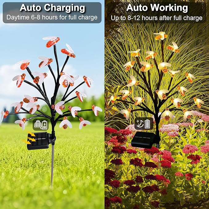 - 🐝【Auto On/Off】The bee lights solar powered are equipped with 800mAh Ni-MH battery solar panel. Charge in the sunlight for 6-8 hours during daytime, fully charged can work for more than 8-10 hours at night, the bee lights will automatically turn on at dusk, turn off at dawn, you don't need to switch the light on and off frequently or worry about the battery running out of power, which is energy-saving and environmentally friendly and at the same time reduces the cost for you.