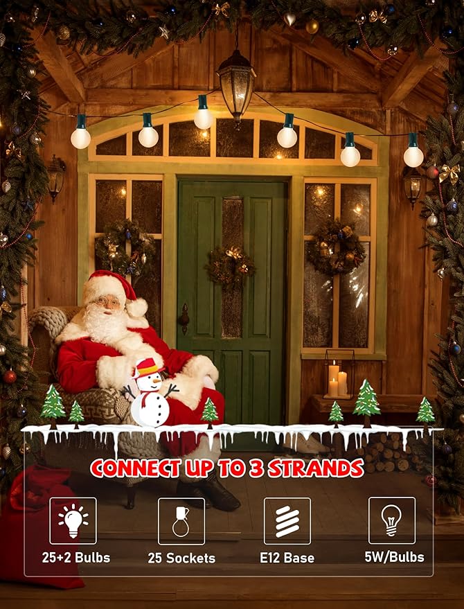 - Energy-Efficient E12 Candelabra Base: 25 feet outdoor christmas string lights with 27 Frosted White G40 Bulbs, G40 incandescnet light bulbs have E12 /C7 candelabra bases, each bulbs 5W, 120V, 125W per string, hanging outdoor patio lights UL Listed for outdoor & indoor use, providing a perfect balance of light distribution to cover patios, decks, gazebos, and more.