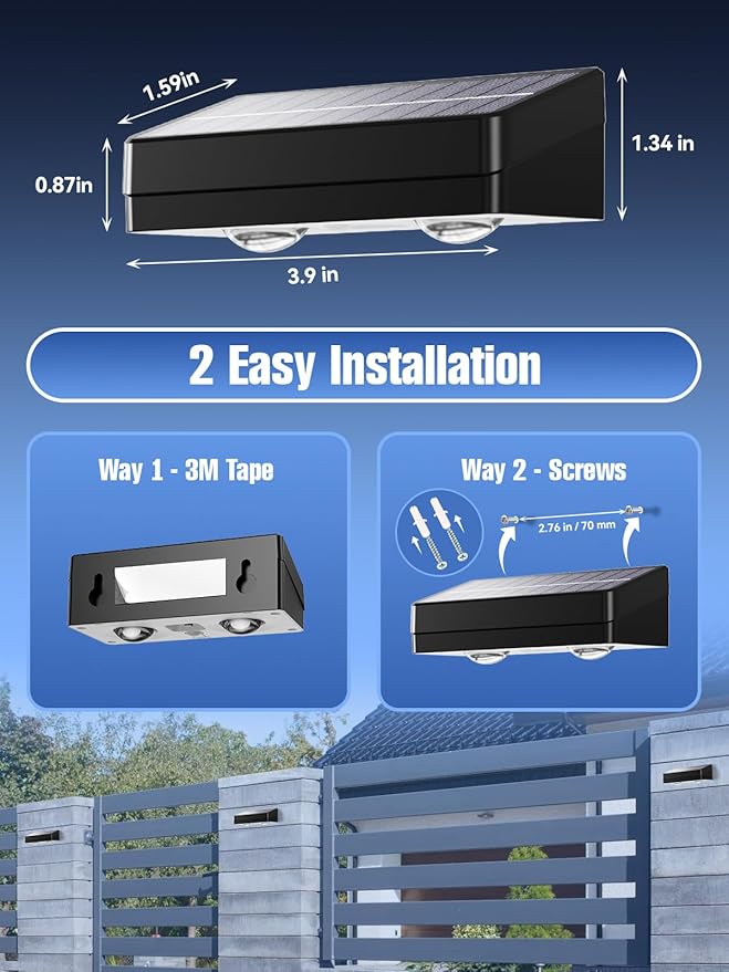 - 【2 Easy Installation Methods】Our solar fence lights outdoor waterproof led can be securely mounted using the included screws or 3M tape. Installation instructions are provided for your convenience. They can be installed within minutes on surfaces such as wood, metal, vinyl, or concrete, meeting the installation requirements of various environments. No electrical wiring or professional electrician is required for installation, which saves on labor costs