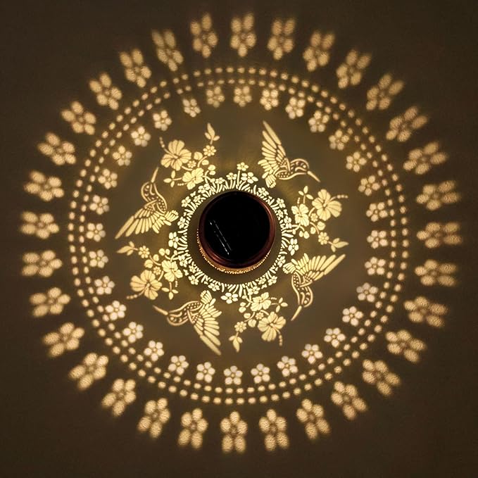 - 【Perfect Garden Decorative】- Hummingbird solar lanterns adopts hollow out design and butterfly pattern. Solar lanterns could project beautiful patterns, creating a gorgeous and warm atmosphere. Perfect for decorations for garden,patio,lawn,backyards,porch and many other scenes.When lit at night, adding a touch of color to your garden.Size: 7"H x 4.5"W x 4.5"L