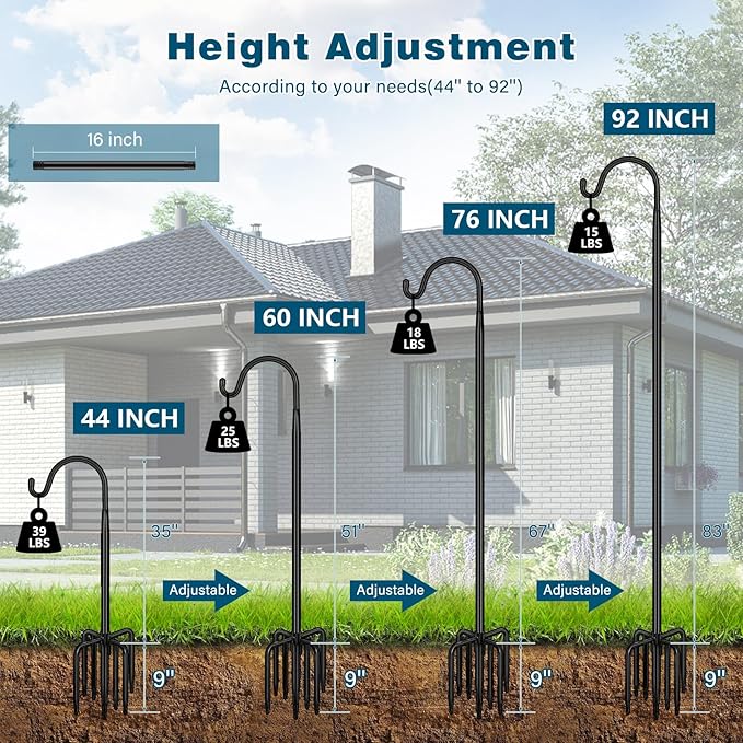 - 【HIGH QUALITY & ADJUSTABLE】 The height of the shepherd's hooks for bird feeder is 92 inch and the diameter is 3/4 inch. Our garden hooks for hanging are made of high quality iron, the black coating on the surface is rust resistant. The height of the pole for bird feeders for outside can be adjusted by adding or reducing the pole sections, each pole section is 16 inch. So you can adjust the height to 76 inch, 60 inch or 44 inch.