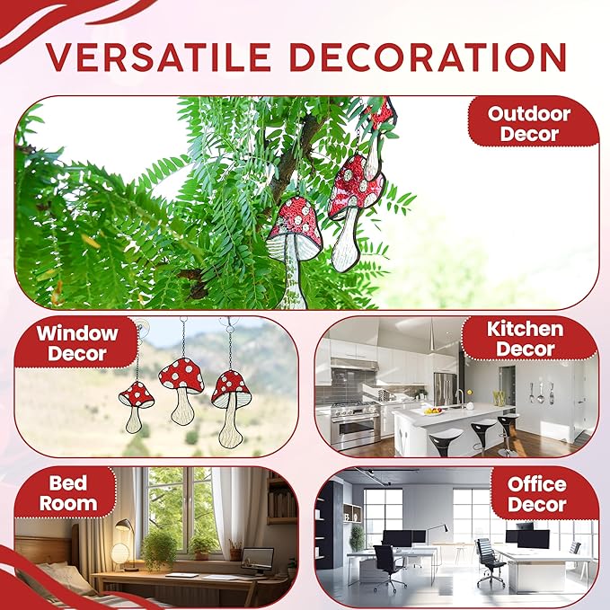 SENSORY4U Fly Agaric Hand-Painted Mushroom Stained Glass Suncatcher 3-Pack - Moon and Toadstool Window Hanging Ornaments - Nature-Inspired Home Décor for Plant and Mushroom Lovers
