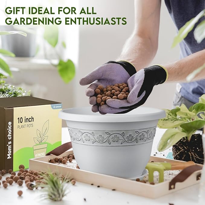 10 Inch Plant Pots with Drainage Hole - Lightweight Flower Pots for Herbs and Flowers - Home Decor Plastic Planters for Indoor Outdoor Plants- Pack of 4 (White, 10 inch)