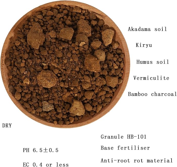- PREMIUM INGREDIENTS - Specialized soil for Lucky Bamboo, Rhapis excelsa (Lady Palm), Guanyin Bamboo —— Akadama, Kiryu, Humus, Vermiculite, Bamboo charcoal, pH 6.5±0.5, EC below 0.4, Weighs Approximately 9.0 lbs