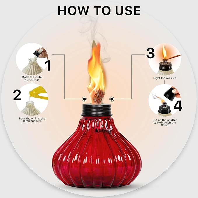 - EASY TO REFILL & USE: Just open the top cap of the table torches to replenish the torch oil every time you need a refill. Besides, you can use the snuffer cap to extinguish the torch's flame and protect the wick after use. When not in use, these table torches are perfect for decorations during outdoor gatherings, camping, etc.