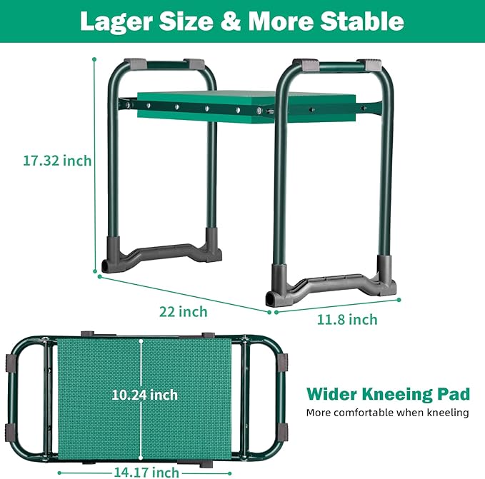 - 【WIDER KNEELING PAD & STABLE】 This Upgraded garden kneeler and seat is built with large soft kneeling pad: 10.24 inch wide soft EVA foam pad is more comfortable when sitting or kneeling. Besides, wide metal frame is more stable during use, no worries about tipping over.