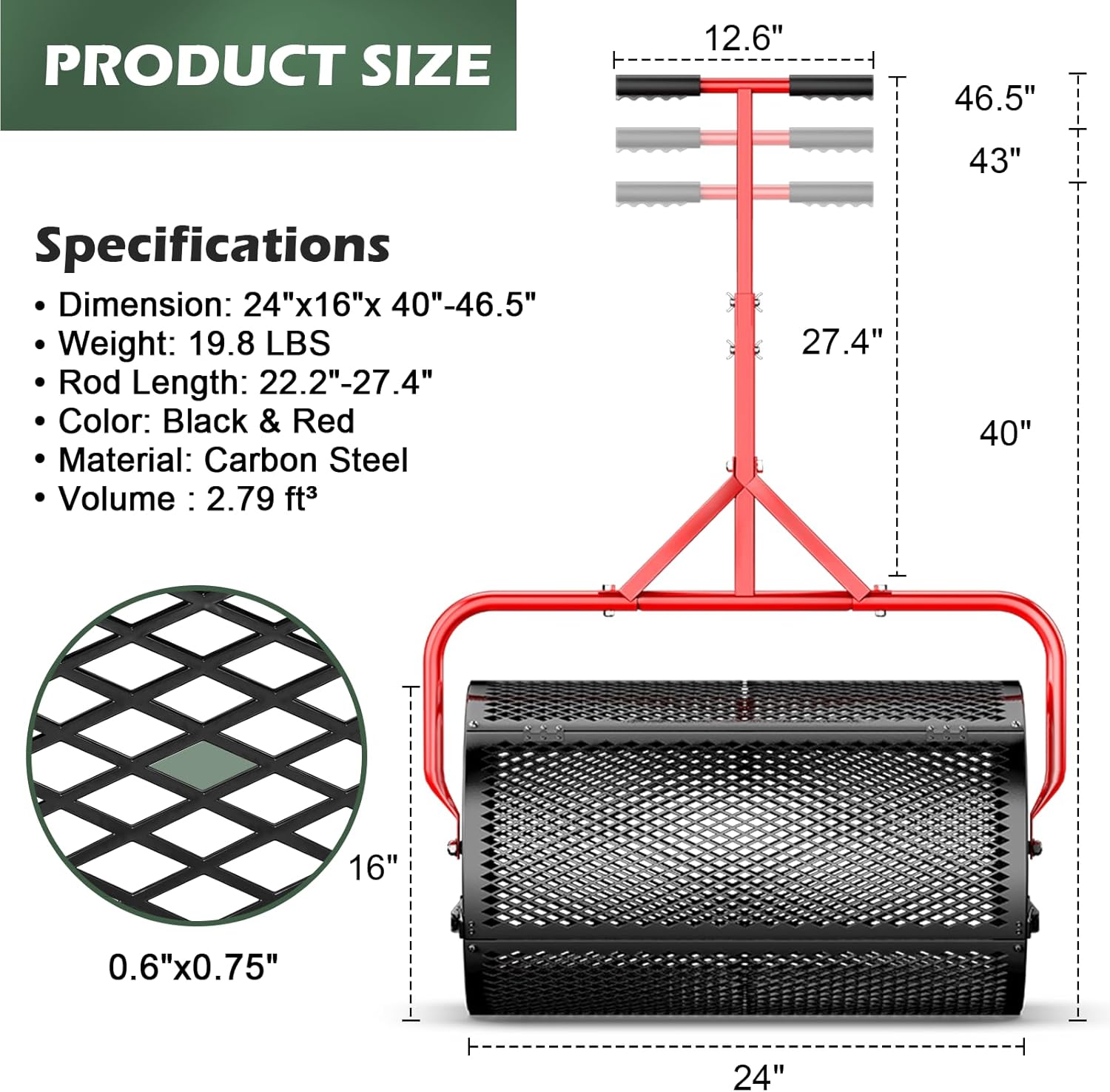 Compost Peat Moss Spreader for Lawn, 24 Inch Compost Roller Spreader with Adjustable T-Shaped Handle, Upgraded Side Clasps, Durable Lightweight Metal Roller, Lawn Garden Yard Care (Black)