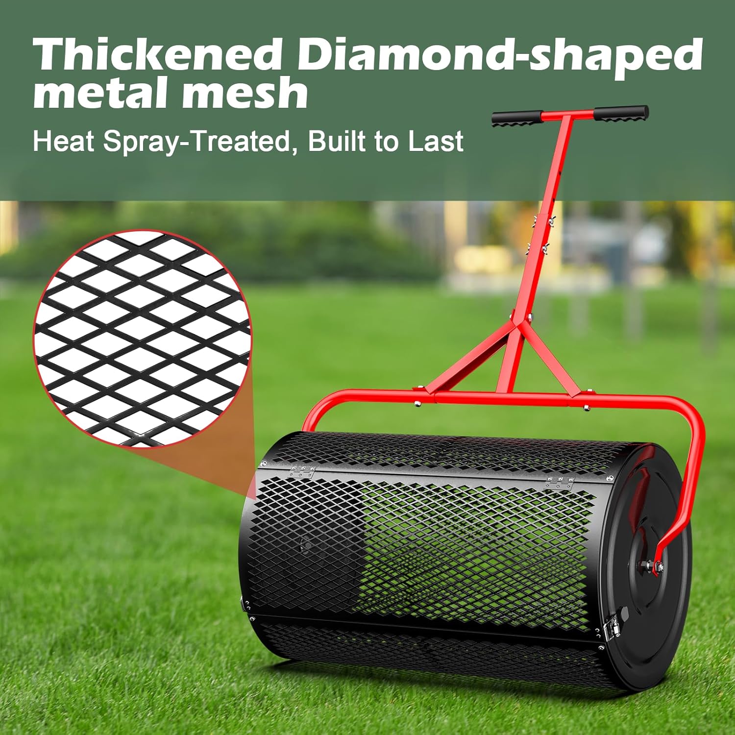 - [Thickened Diamond-Shaped Metal Mesh] Featuring a thickened diamond-shaped metal mesh, this peat moss spreader for lawn is built for durability. The robust metal frame coated with a thermal spray finish ensures it withstands frequent use, supporting your garden maintenance with reliability.