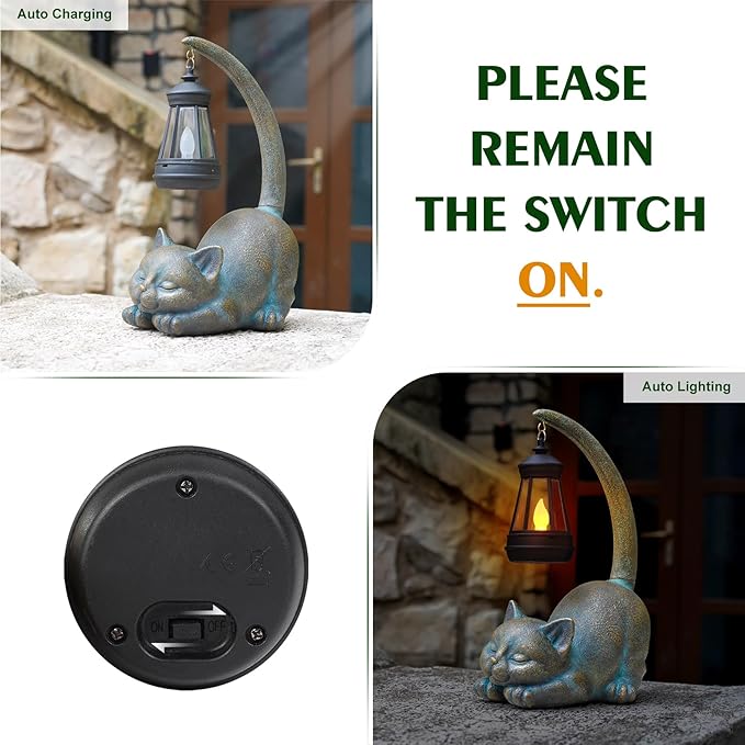 • Automatic Solar Charging: Turn on the switch and place the solar statue in sunlight for 6-8 hours of charging. It will light up automatically at night for 8-10 hours. The lantern is automatically photosensitive. NOTE: If you are not sure whether the button is turned on, please cover the lantern with your hand and keep out of the sun. If the switch is turned on, it will light up.