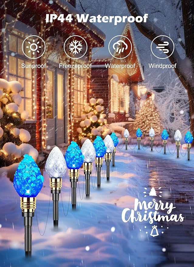 - Waterproof Christmas Yard Lights Decoration: These Christmas walkway lights for the yard comply with the rain test of UL certification. These holiday decoration lights are wonderful decorations for home, patio, lawn, garden, bistro, pub, cafe, restaurant, shopping center, supermarket, New Year, birthday, gathering, disco ball party, dinner party, evening party, the plug is not waterproof, it should be protected from the rainy day