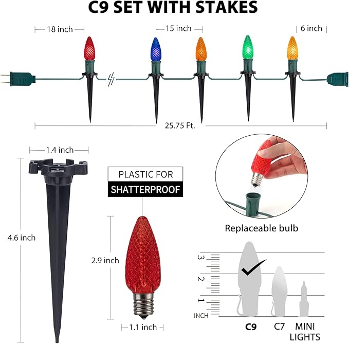 - Two Installation Ways: Hang up this C9 Christmas stakes lights around your roof line to outline entire house will be amazing, or plug the C9 Christmas lights with stakes alongside the walkway or lane in lawn or garden; These waterproof Christmas outdoor decorations lights for the yard comply with the rain test of UL certification and wonderful decorations for home, patio, garden