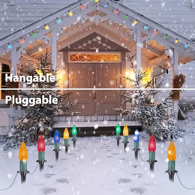- Two Installation Ways: Hang up this C9 Christmas stakes lights around your roof line to outline entire house will be amazing, or plug the C9 Christmas lights with stakes alongside the walkway or lane in lawn or garden; These waterproof Christmas outdoor decorations lights for the yard comply with the rain test of UL certification and wonderful decorations for home, patio, garden