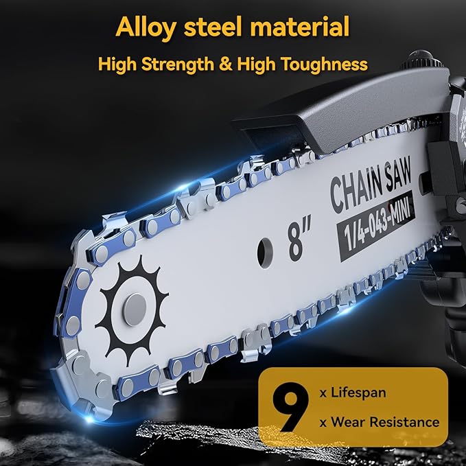 - 2024 Upgraded Motor: A 1000W pure copper motor drives the mini chainsaw at 30ft/s and delivers faster and more efficient cuts, cutting 8-inch logs in 8s with no effort(actual time may vary depending on the size and hardness of the wood). Thanks to manganese steel & deep quenching process, it ensures smooth cutting
